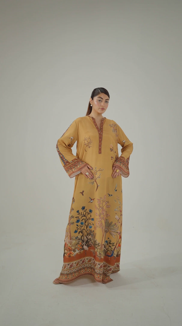 Unstitched Digital Printed Airjet Lawn 2PC Set – Mustard Elegance with Floral & Bird Motifs